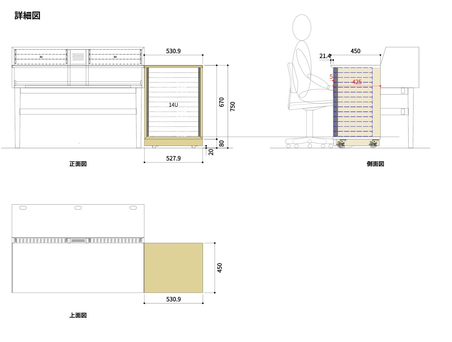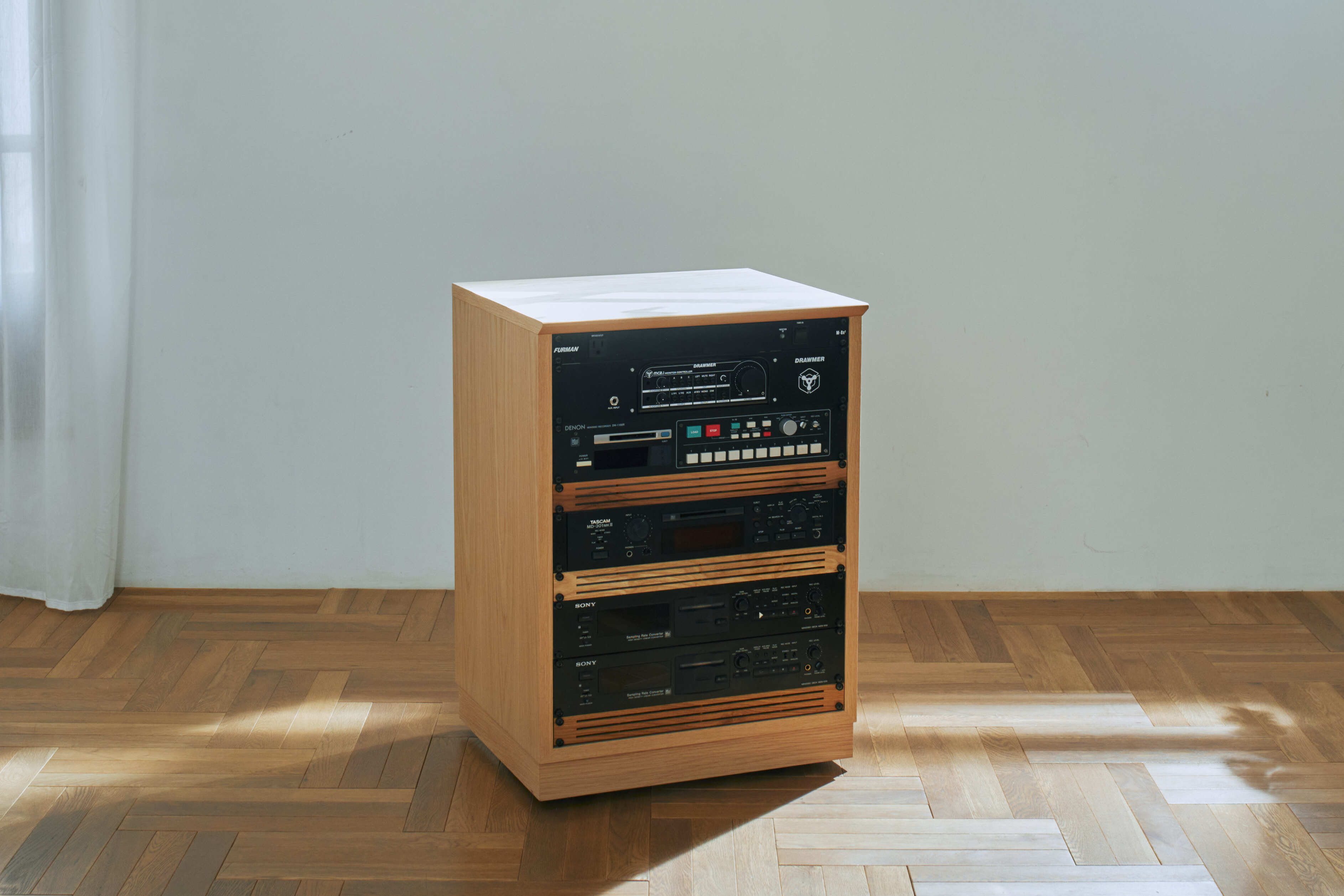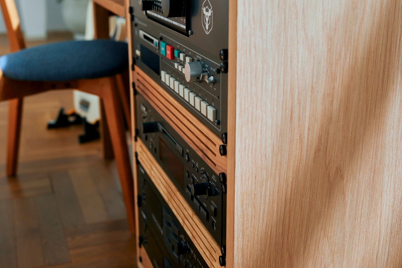.mudeskとデザインを統一させた14Uアウトボードが収納可能なラック。